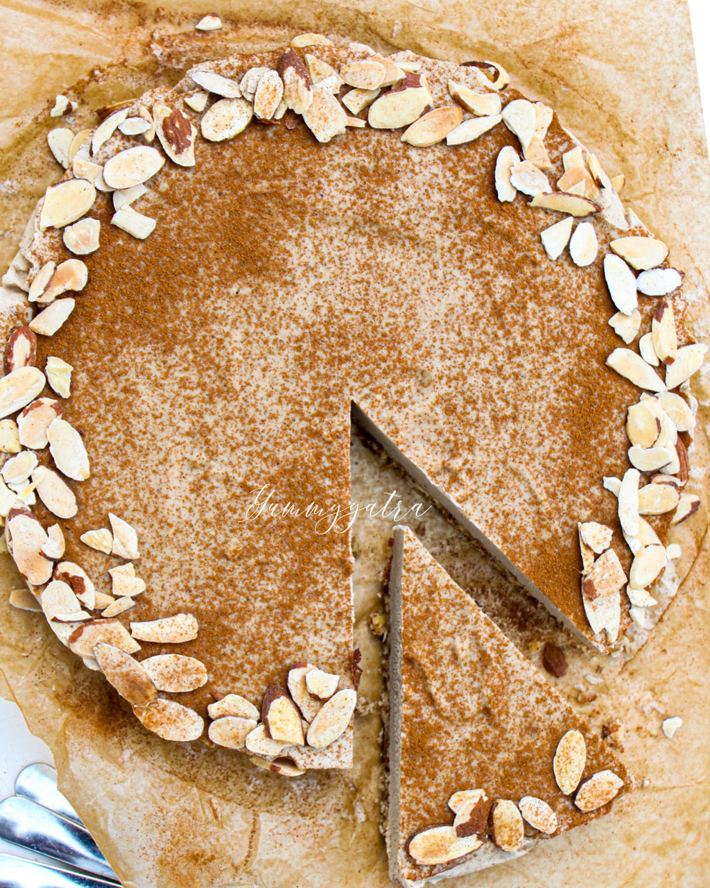 8. Take out the pan from the freezer, and add the filling on top of the base. Smooth out evenly, sprinkle the ground cinnamon, and top with the toasted unsalted sliced almonds.
