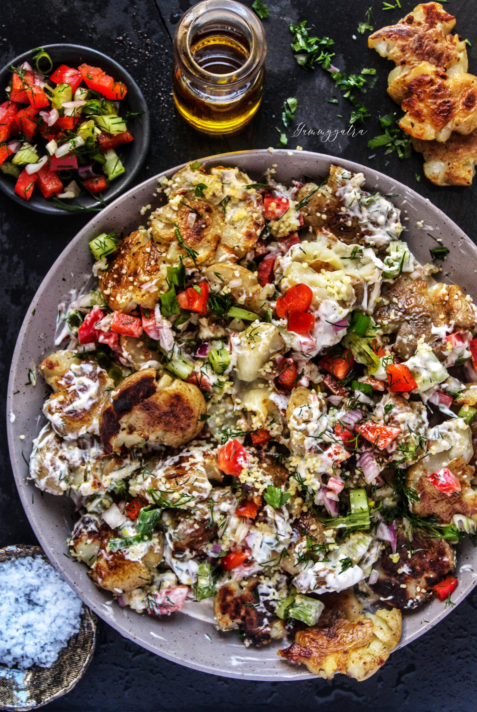 Top the smashed potatoes with the couscous-herb mix, spoon the dressing, combine gently